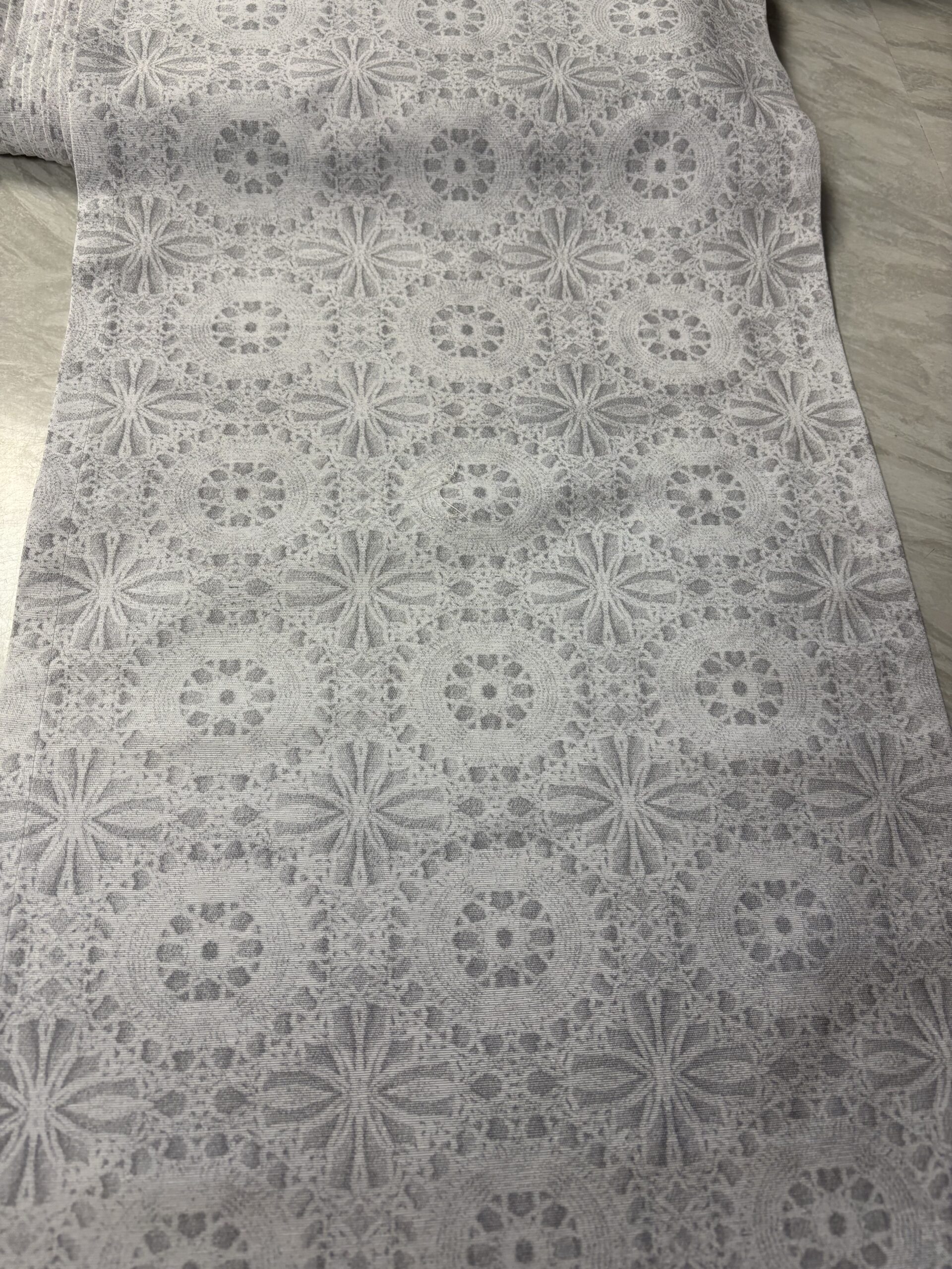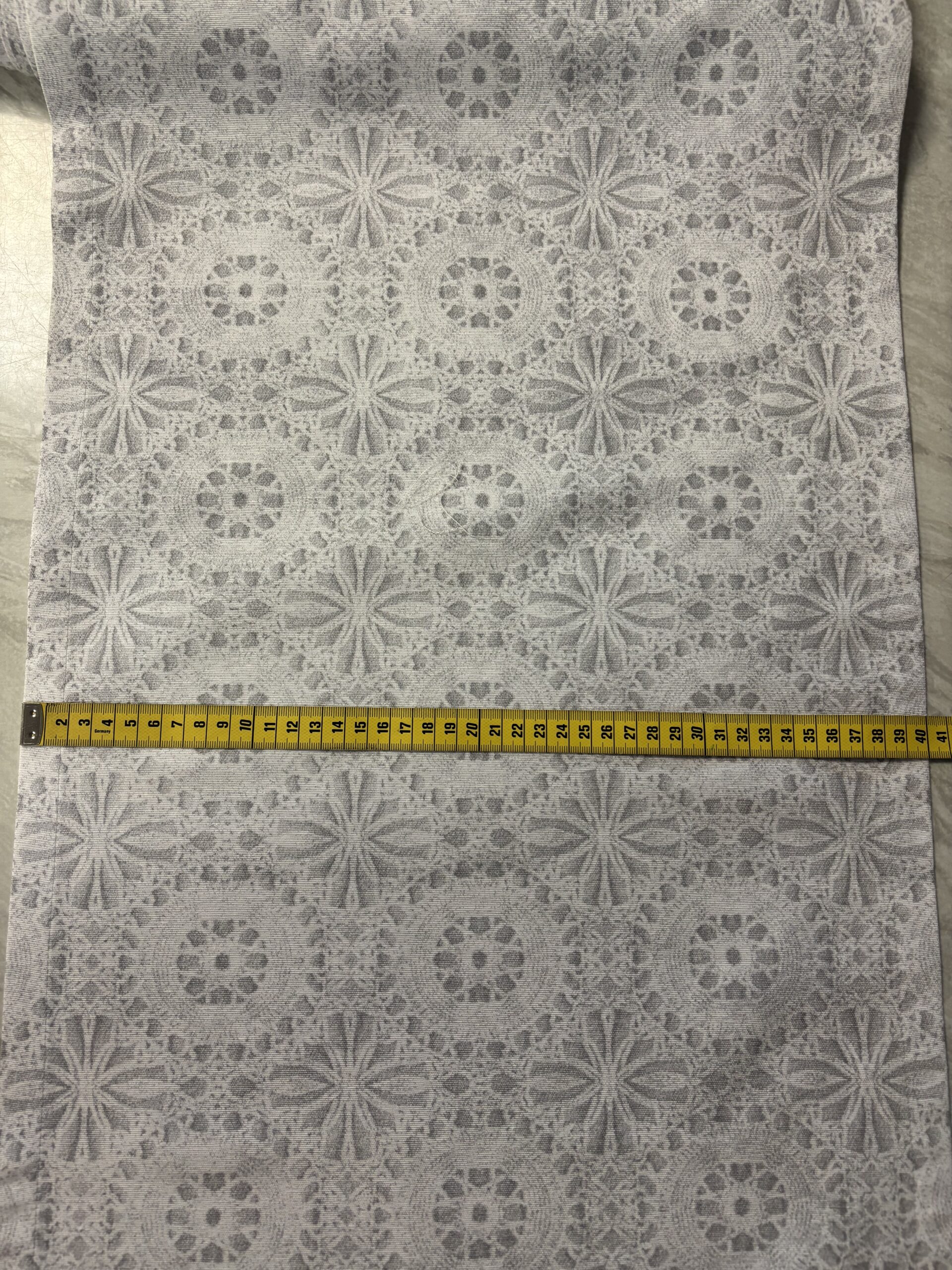 Hinta/m kaitaliinakangas 100% puuvillaa, leveys 40 cm, painettu pitsikuvio, väri vaaleanharmaa