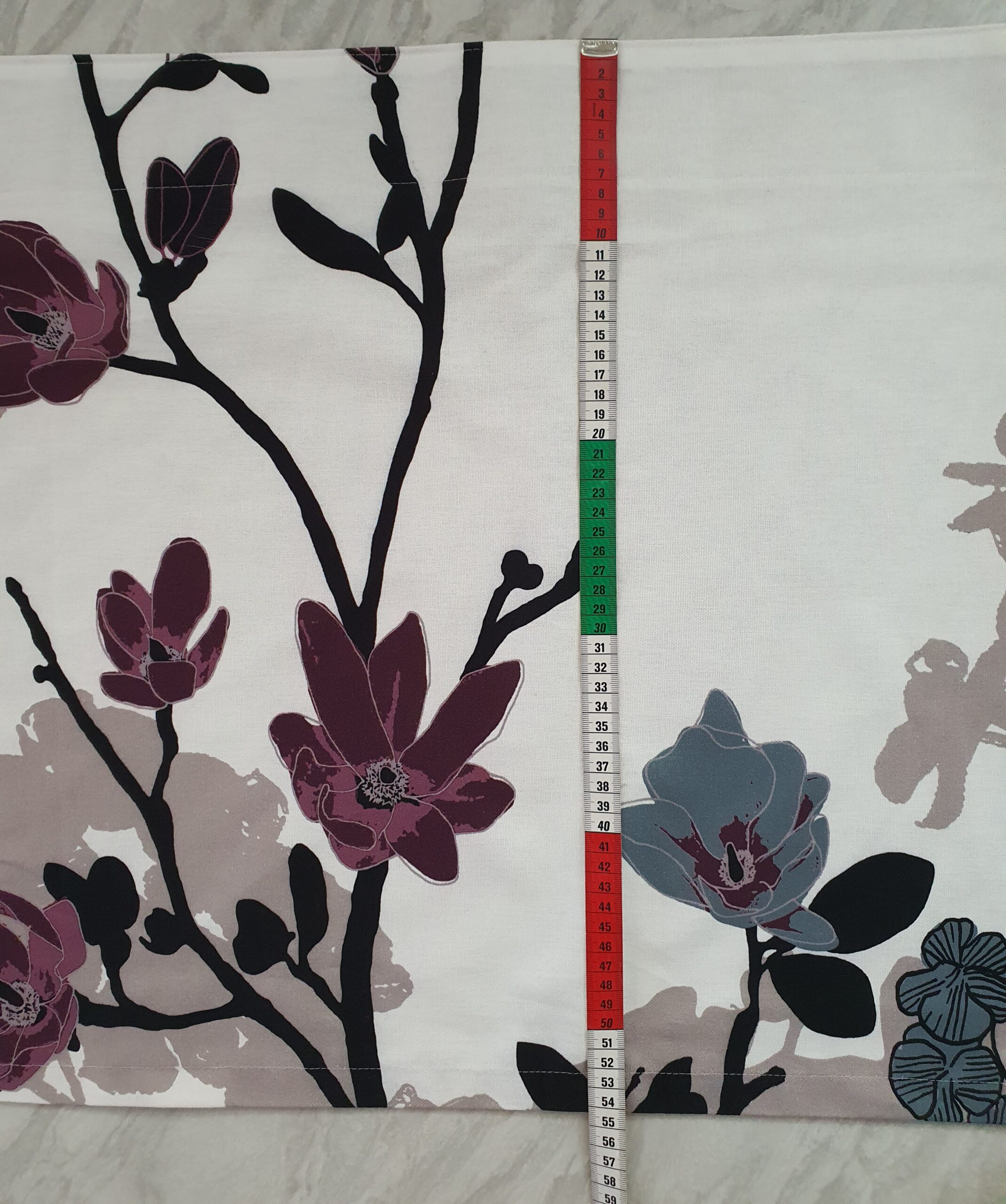 Hinta/ 10 cm sivusuunnassa, korkeus 55 cm, kapan takana tankokuja nailonsiimoilla, jotka vekittävät kapan kauniisti, kujan leveys litteänä 5,5 cm, 100% puuvillaa