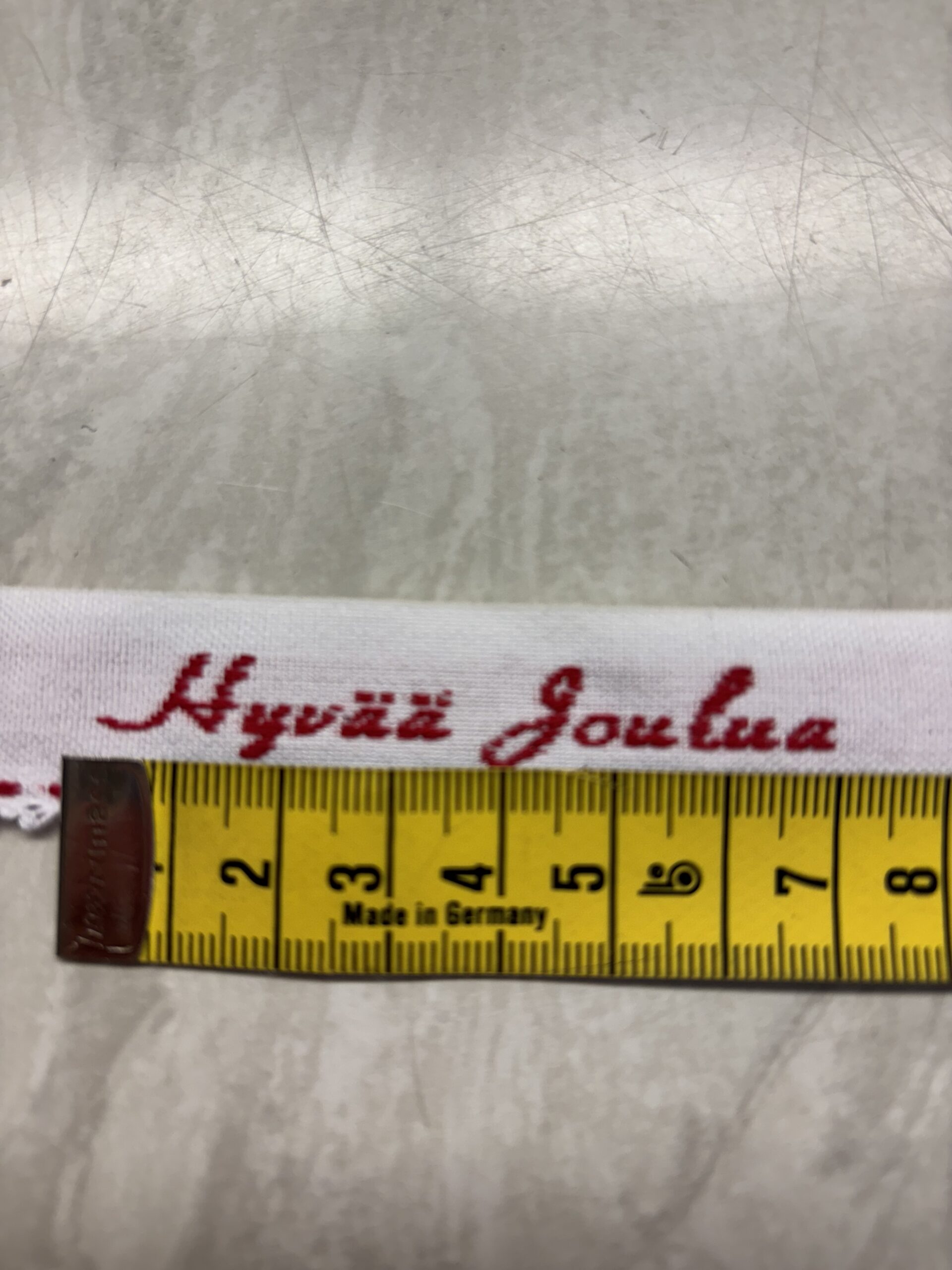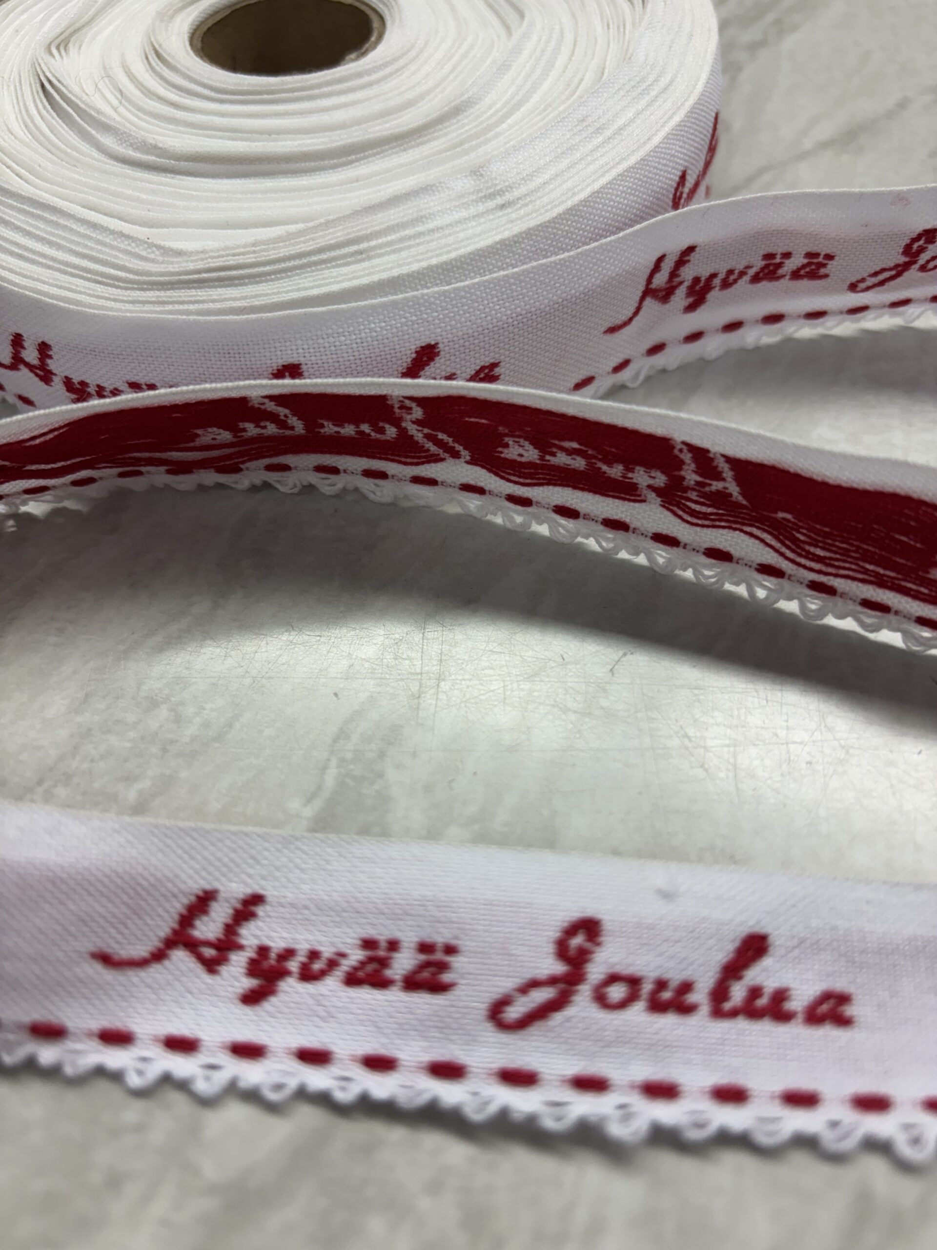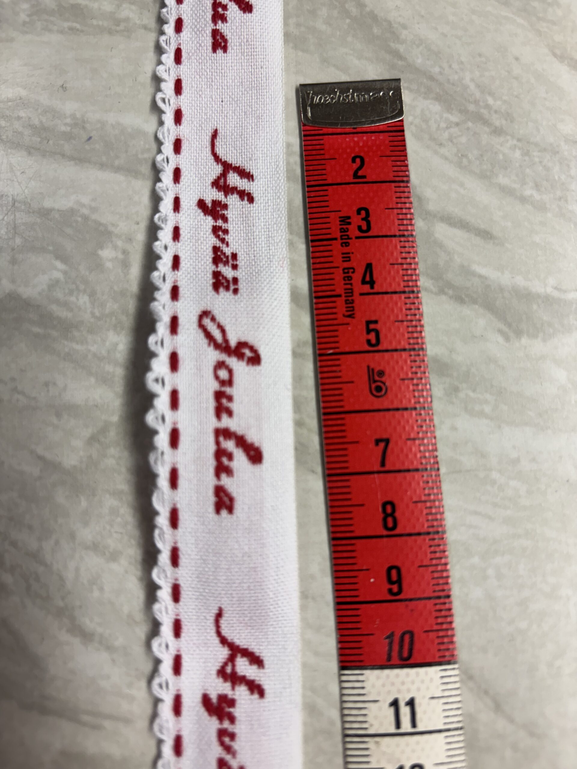 Hinta/ 10 cm, Hyvän Joulun toivotus kirjailtuna tekstiilinauhaan, sopii: korttiaskateluun,paketteihin ym., leveys 22 mm, 0,5 m nauhaa sisältää 6 kpl jouluntoivotuksia!
