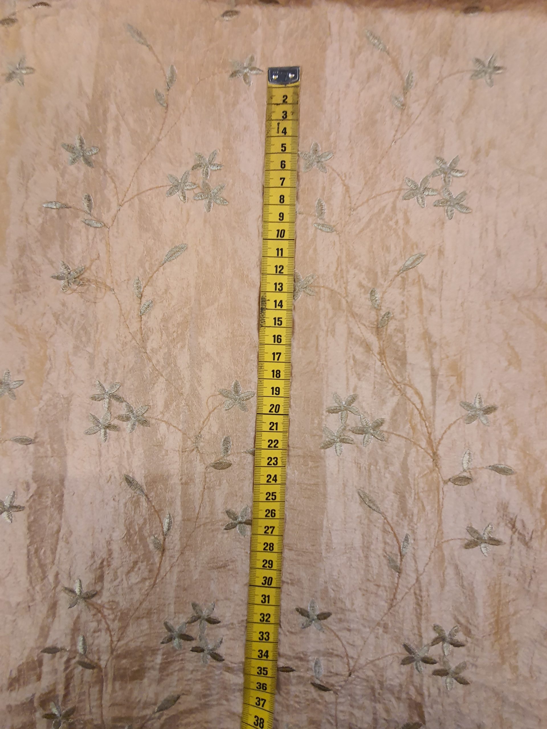 Hinta/10 cm, prodeerattu taftikangas, leveys 150 cm, kuvio ulottuu 140 cm:n alueelle, 52% % polyesteria /48% polyamidia , soveltuu juhlavaatteisiin, verhoiksi, koristetyynyihin ym., kuvioraportti 26,5 cm, pohjaväri beige