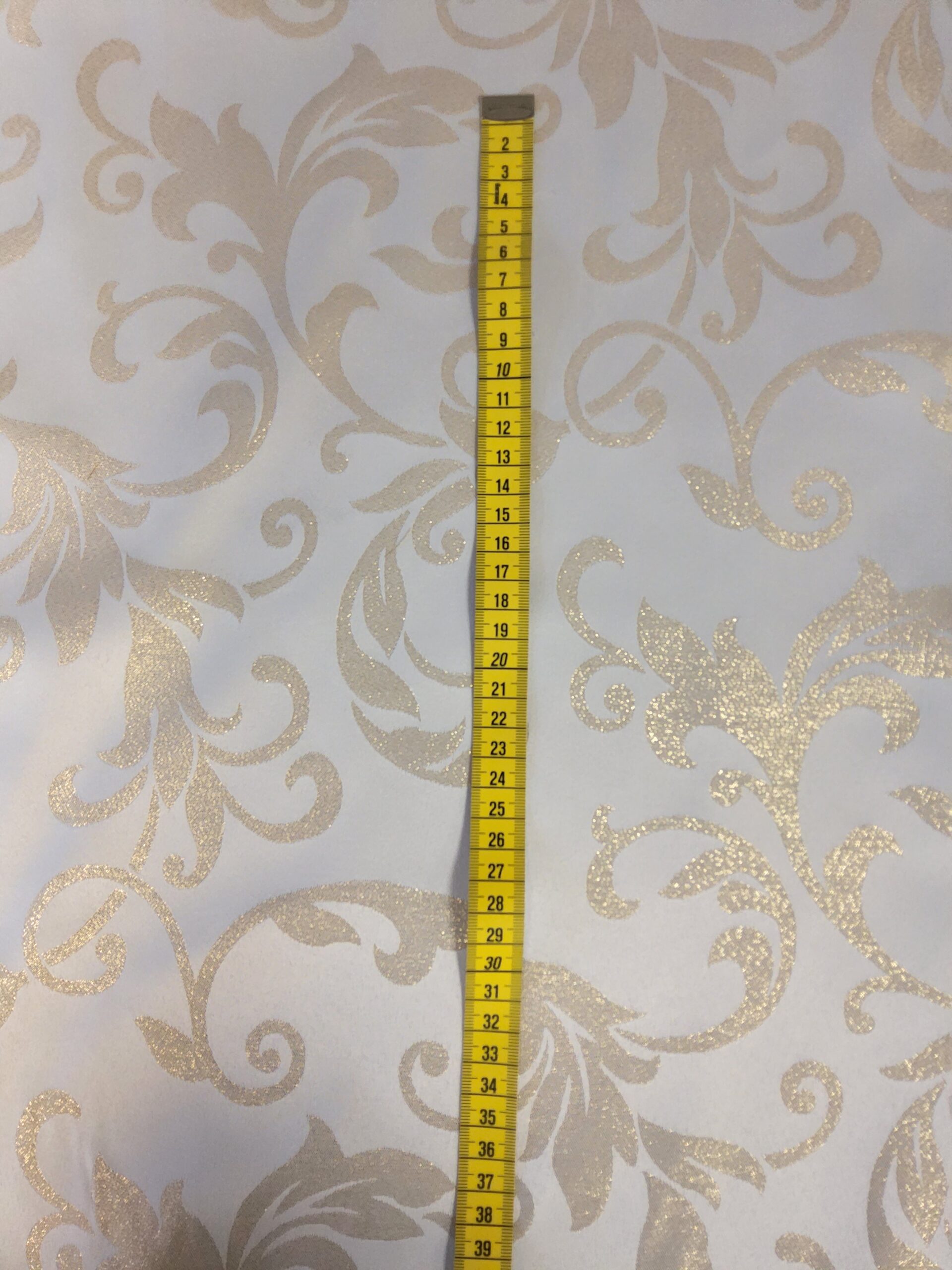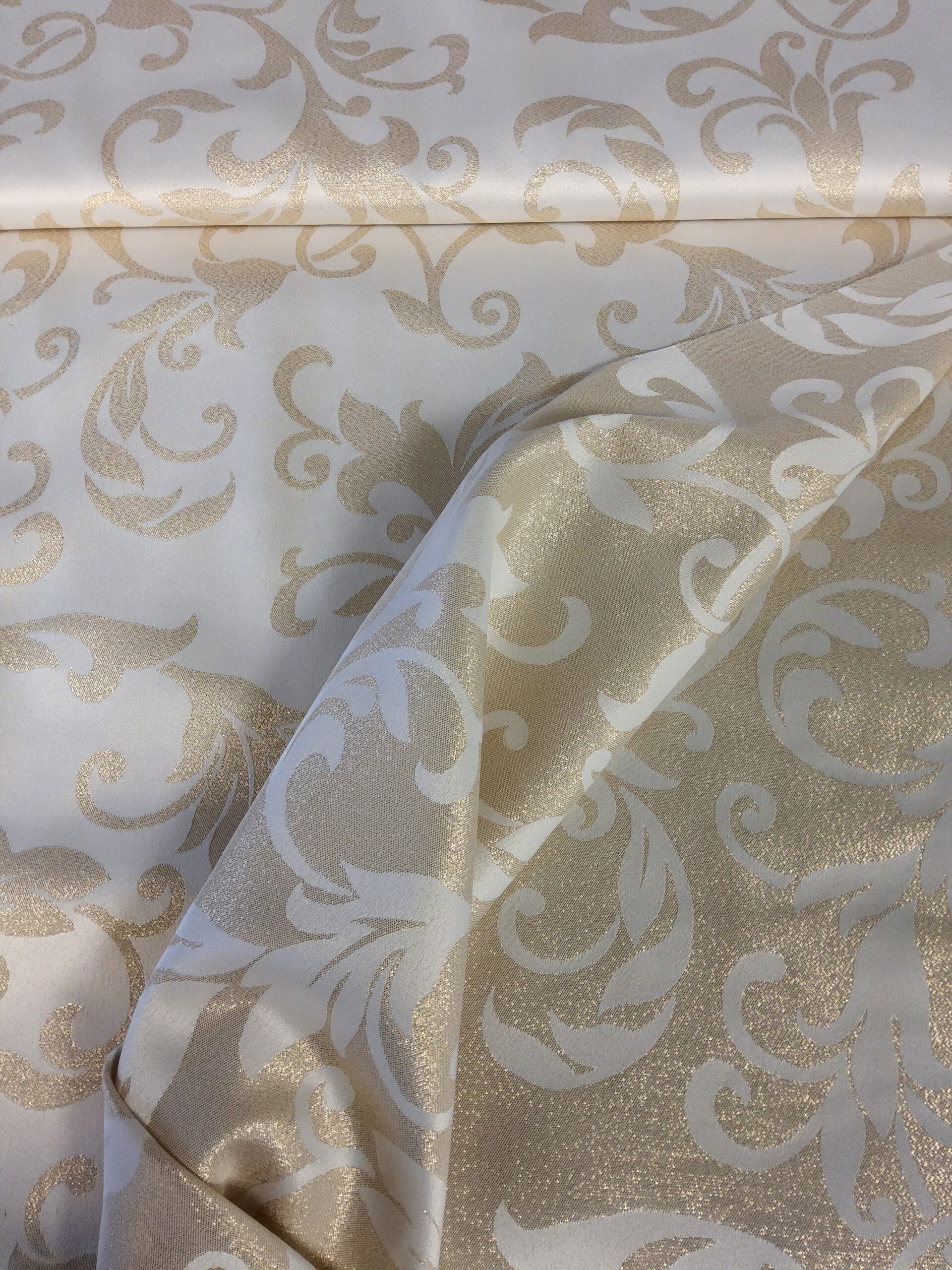 Hinta/10 cm,satiinikangas, jossa kultaköynnöskuvioinen kudos, leveys 140 cm, kuvioraportti n.37 cm, 100% % polyesteria , soveltuu juhlavaatteisiin, verhoiksi, koristetyynyihin, pöytäliinaksi ym.,