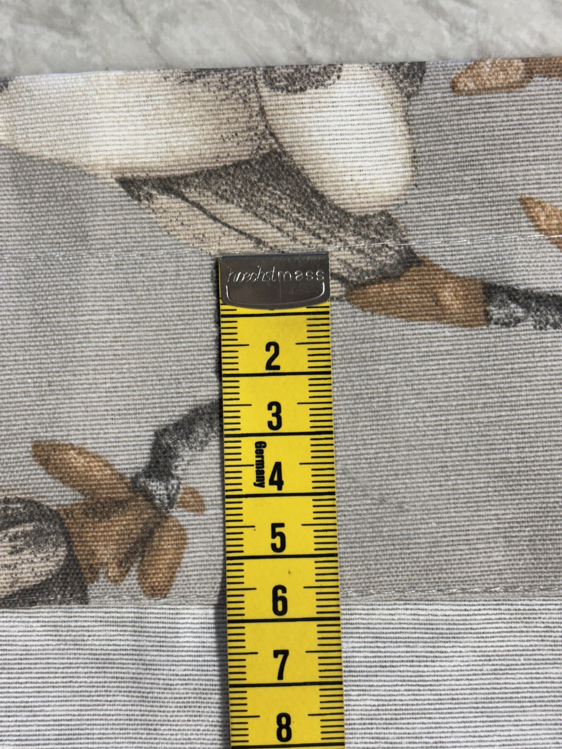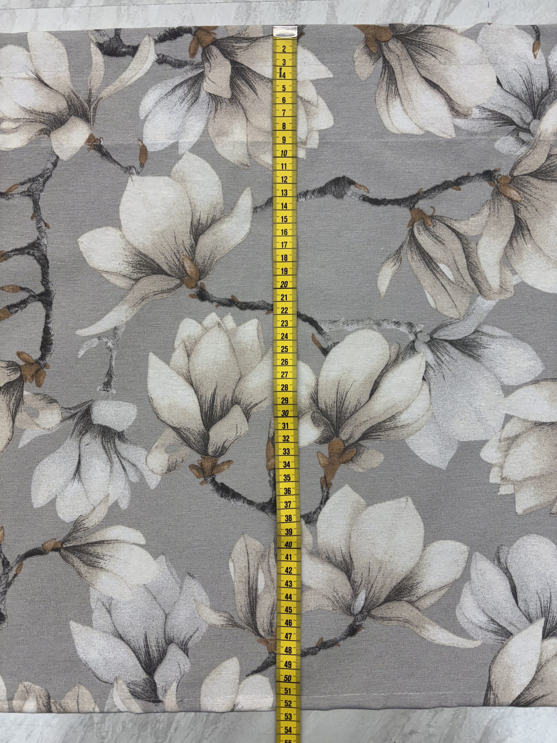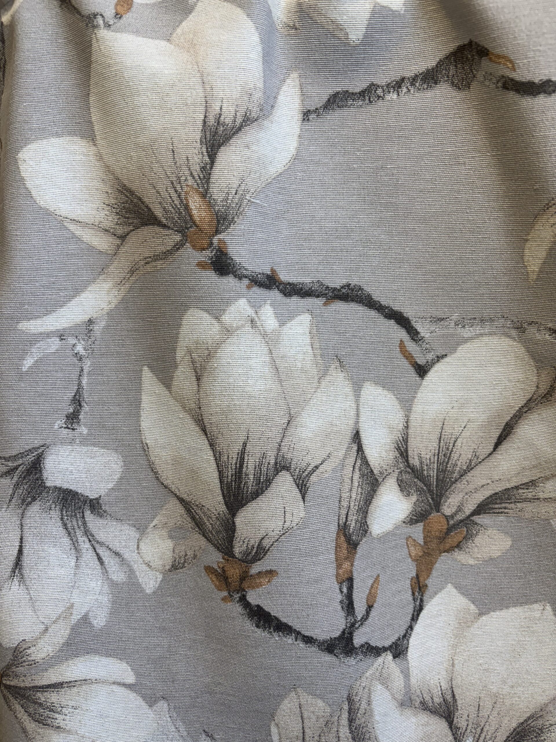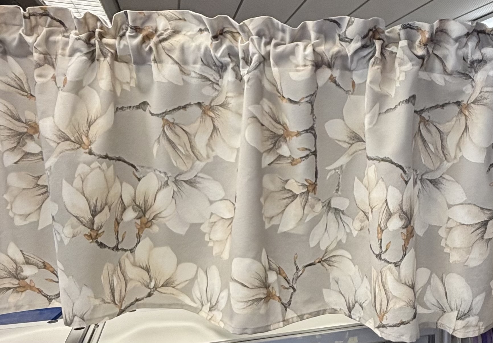 Hinta/ kpl, täysin valmis kappaverho, pohjaväri harmahtavan beige, leveys 250 cm, korkeus n. 50 cm, yläreunassa harja 3 cm ja tankokuja 5,5 cm, materiaali 70% puuvillaa/ 30% polyesteria