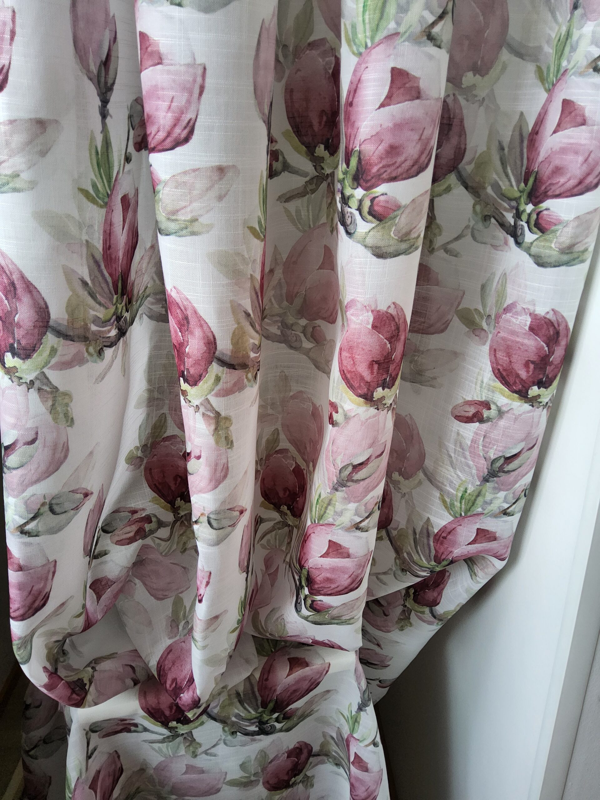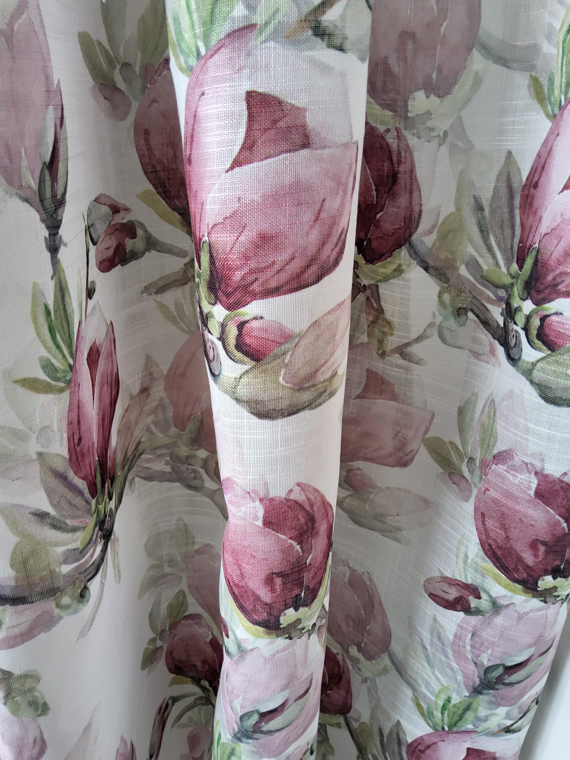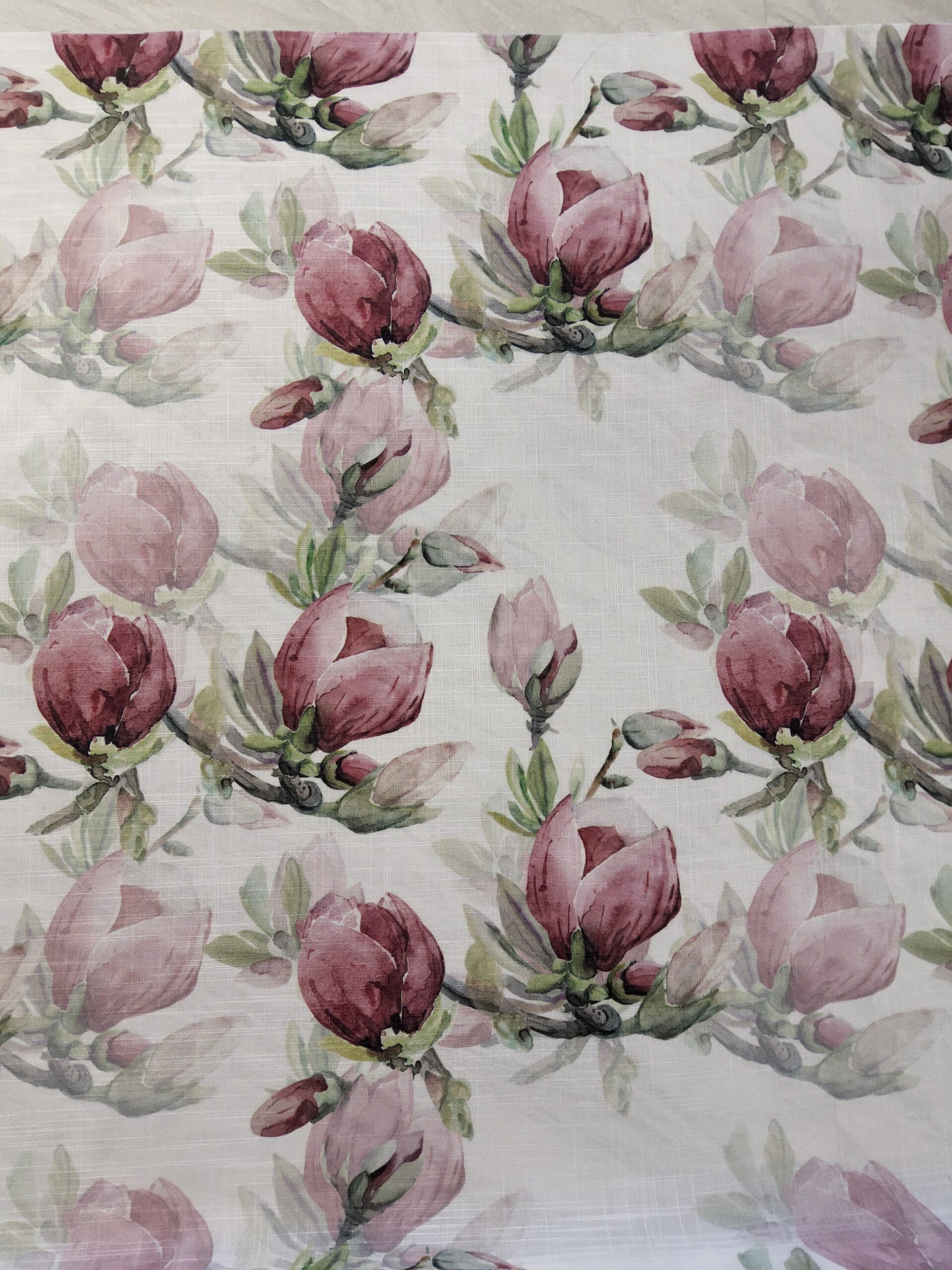 Hinta/ 10 cm,  läpikuultava valkeapohjainen kukkakuvioinen verhokangas, materiaaali  100% polyester, leveys 145 cm,kuvioraportin korkeus 39 cm